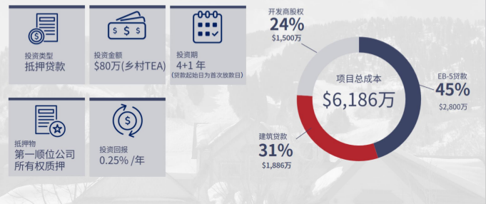 4. 资金结构:6186万,开发商股权$1500万(24%),EB-5贷款$2800万(45%),建筑贷款$1886万(31%)投资期限:4+1年(贷款起始日为首次放款日);投资回报率:0.25%/年;