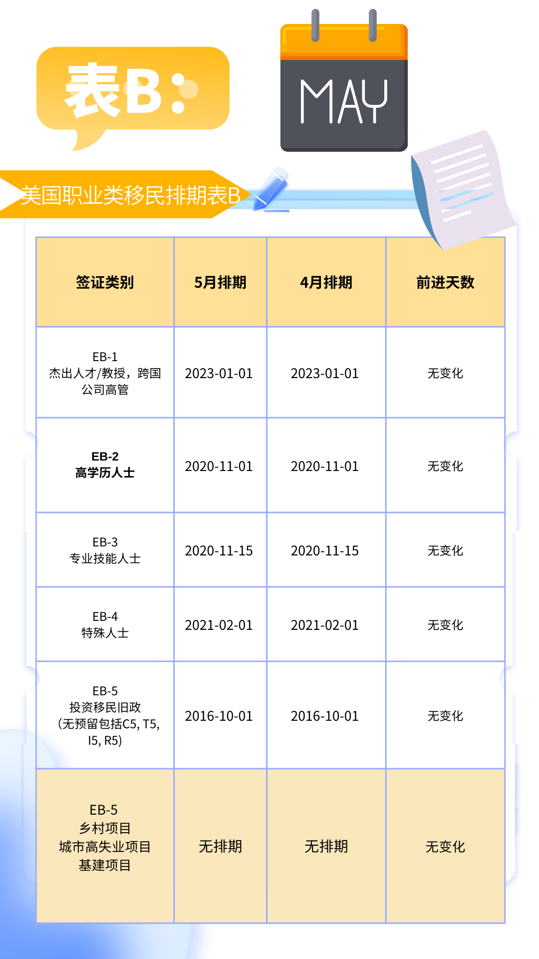 表B:递交申请日(Dates For Filling)中国大陆申请人排期情况EB-1: 2023年1月1日,无变化; EB-2: 2020年11月1日,无变化; EB-3技术类: 2020年11月15日,无变化; EB-4:2021年2月1日,无变化; EB-5直投及区域中心:2016年10月1日,无变化;