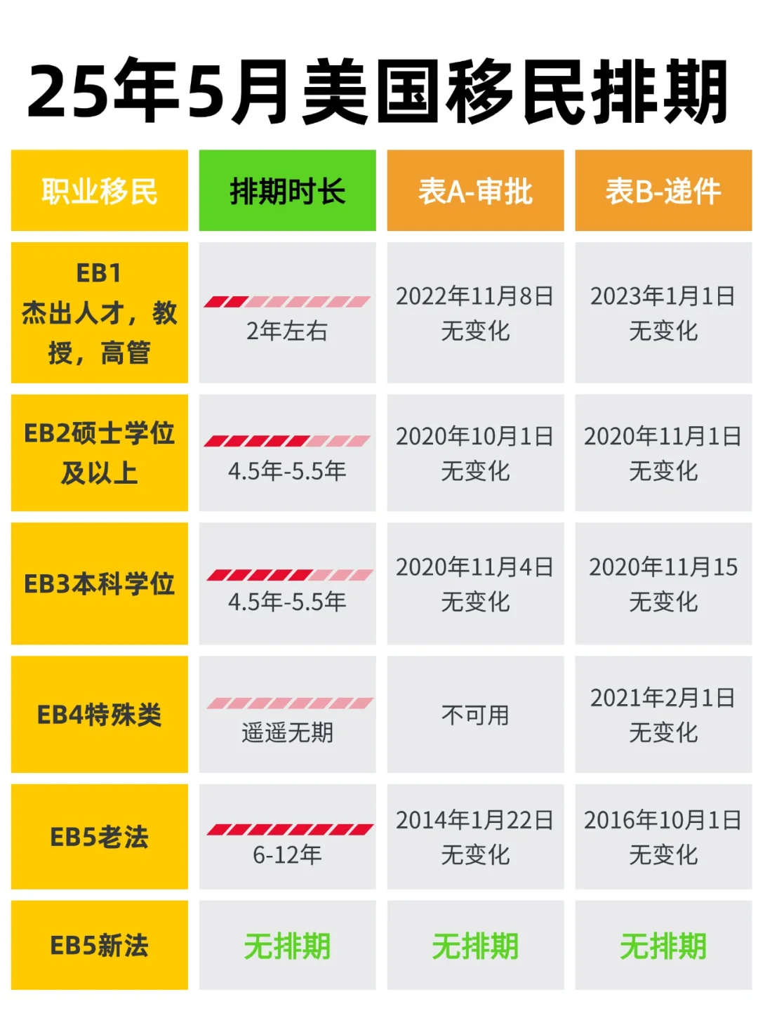 25年5月排期公布:EB5预留签证仍无排期,其余无变化