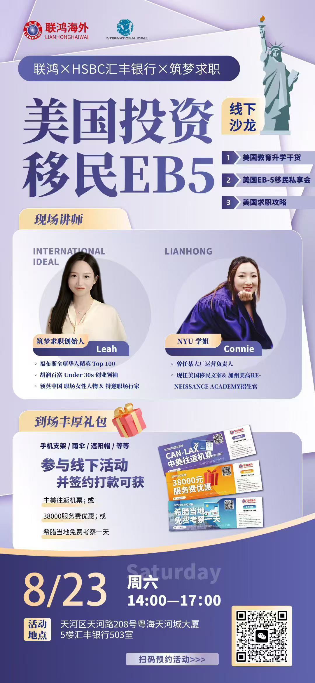 8月23日14点:美国投资移民EB5线下沙龙,联鸿xHSBC汇丰银行x筑梦求职