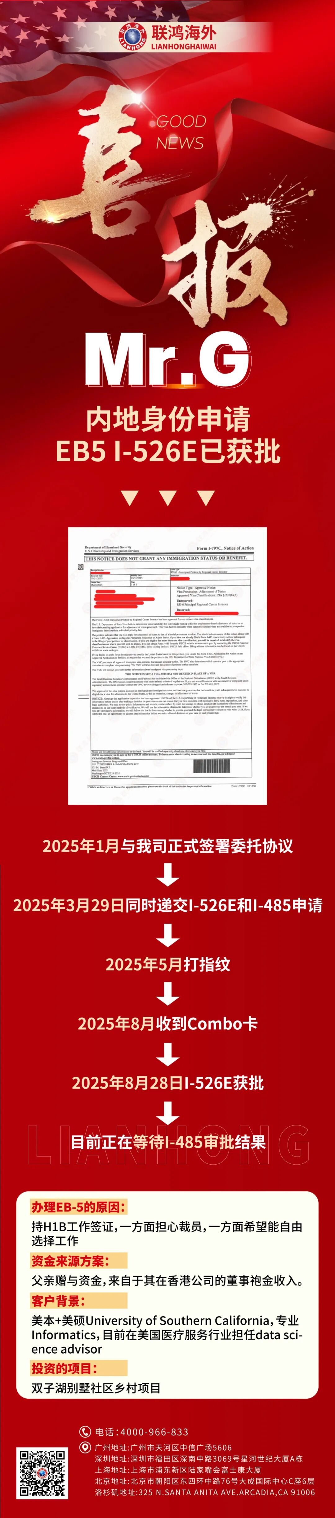 恭喜:联鸿海外又一EB5客户G先生获批I-526E-历时仅5个月