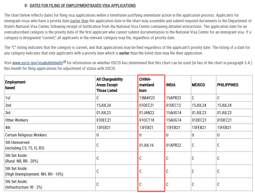 注:表A即移民签证可以被签发的最终审批日期如果申请人的优先日(Priority Dates)在表A的日期之前,就意味着他的排期到了,移民局或签证中心可对他的移民申请进行最终审核,并决定是否签发绿卡。如果表A排期未到,就是因为没有可以使用的移民签证名额,美国移民局和签证中心就不会对他的案子进行最终批准。