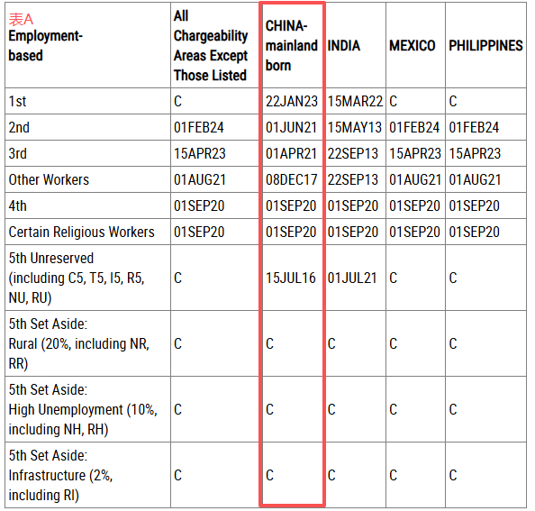 表A:移民签证的最后批准日期(Application Final Action Dates),又称移民排期;