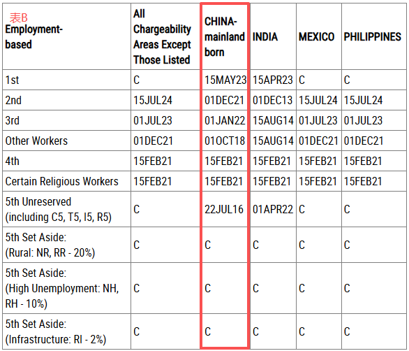 注:表A即移民签证可以被签发的最终审批日期如果申请人的优先日(Priority Dates)在表A的日期之前,就意味着他的排期到了,移民局或签证中心可对他的移民申请进行最终审核,并决定是否签发绿卡。如果表A排期未到,就是因为没有可以使用的移民签证名额,美国移民局和签证中心就不会对他的案子进行最终批准。