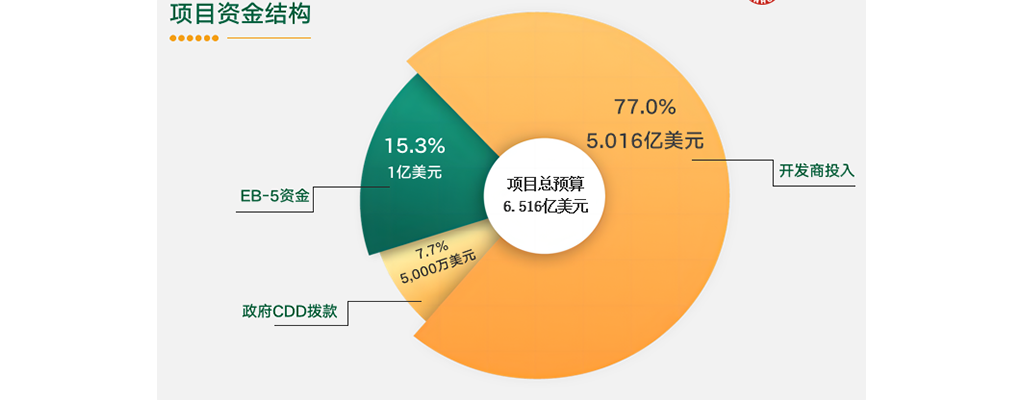 5.资金结构:项目总预算6.516亿美元,其中开发商投入5.016亿美元,占比77%;EB5资金1亿美元,占比15.3%,另外还有政府CDD拨款5000万美元,占比7.7%。