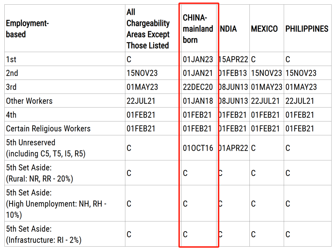 注:表A即移民签证可以被签发的最终审批日期如果申请人的优先日(Priority Dates)在表A的日期之前,就意味着他的排期到了,移民局或签证中心可对他的移民申请进行最终审核,并决定是否签发绿卡。如果表A排期未到,就是因为没有可以使用的移民签证名额,美国移民局和签证中心就不会对他的案子进行最终批准。在美国境外的移民申请人只有自己的排期前进到表A才能走领事馆面签流程。