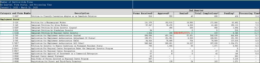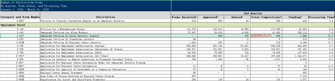 🔺 I-526 审批拒签率达 30%,主要因移民局强化资金路径审核,且数据包含撤案情况;剩余待批案件约 1854 件,预计 2 个季度内消化完毕。