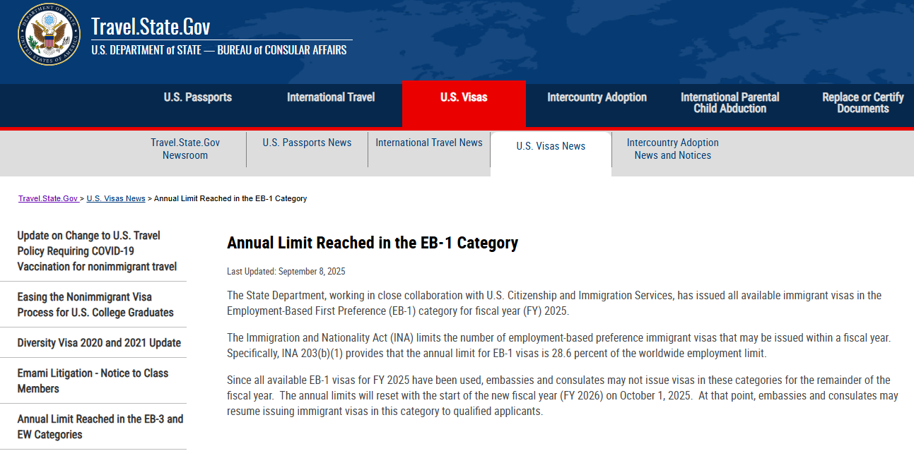 2025年9月8日,美国国务院与公民及移民服务局最新通报显示,2025 财政年度(FY)就业类第一优先(EB-1)移民签证已用尽所有可用配额。根据《移民和国籍法》(INA)203 (b)(1) 规定,EB-1 签证年度限额为全球职业移民总配额的 28.6%,与 EB-2、EB-3 持平。
