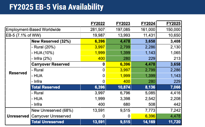 EB-5的32% 预留配额(乡村 / 高失业率地区 / 基建项目)未使用时,可结转至下一财年同一类别。例如,2024财年未使用的3,676张预留配额被转入 2025财年,使总预留配额增至 7,084张。