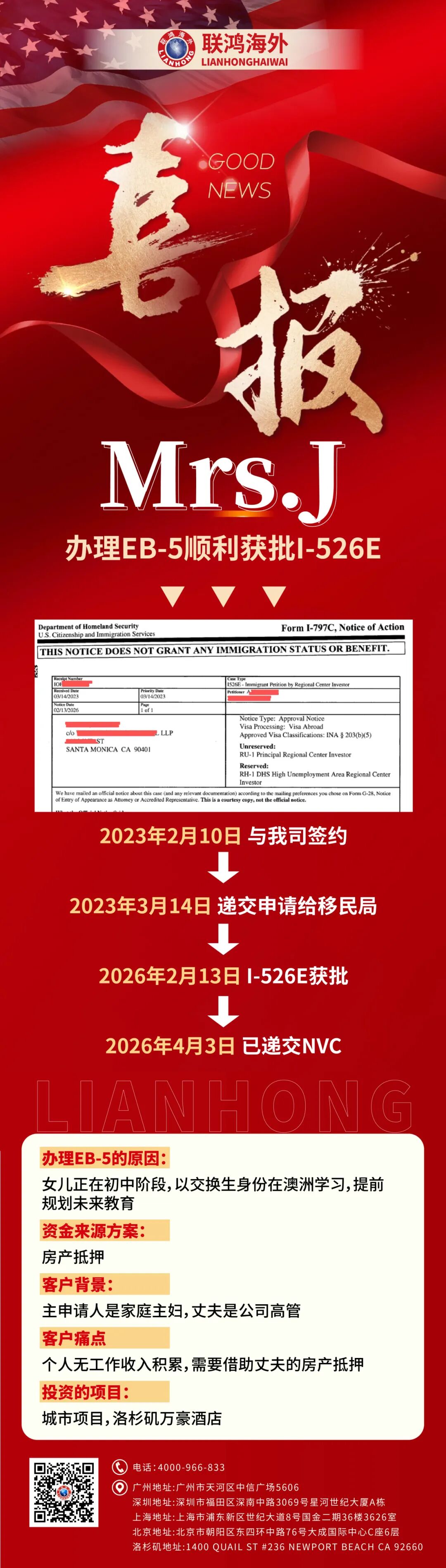 【喜报】房产抵押做资金方案,Mrs.J办理EB-5顺利获批I-526E