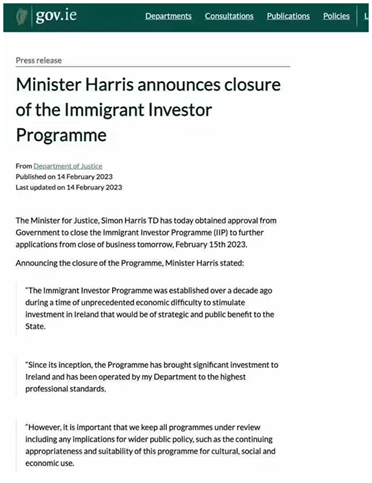 1.2023年2月14日,爱尔兰司法部长西蒙·哈里斯突然宣布,从2023年2月15日关停投资移民计划Immigrant Investor Programme (IIP)。