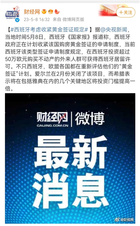 3. 西班牙当地时间5月8日,西班牙《国家报》报道称,西班牙政府正在计划收紧该国购房黄金签证的申请制度。