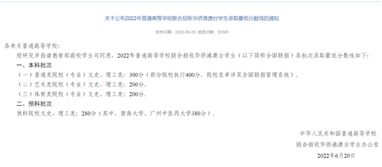 根据教育部公布2022年普通高等学校联合招收华侨港澳台学生录取最低分数线的通知显示,总分750分,华侨生最低300分就能报考普通类院校,艺术和体育类甚至只需200分。