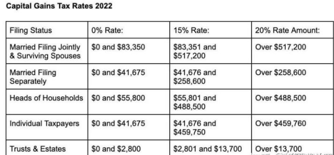 如果投资超过一年,将被认定为长期投资,资本利得税率分为3级:0%、15%和20%,同时会对应报税身份确定收益金额和税率。以夫妇共同申报为例,2022年的资本利得在83,350美元以下的税率为0%,超过517,200美元以上的资本利得税为20%。