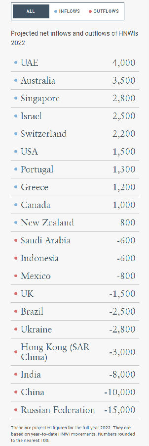 “2022年的预测反映了全球极其动荡的环境。到今年年底,预计将有88,000名百万富翁迁往新的国家,比2019年的110,000人减少22,000人。明年,预计将有有史以来大规模的百万富翁移民潮——125,000 人——富裕的投资者及其家人认真准备迎接新冠疫情后的新世界,全球秩序的重新安排尚未揭晓,而目前气候变化的威胁是一个持续的背景。”