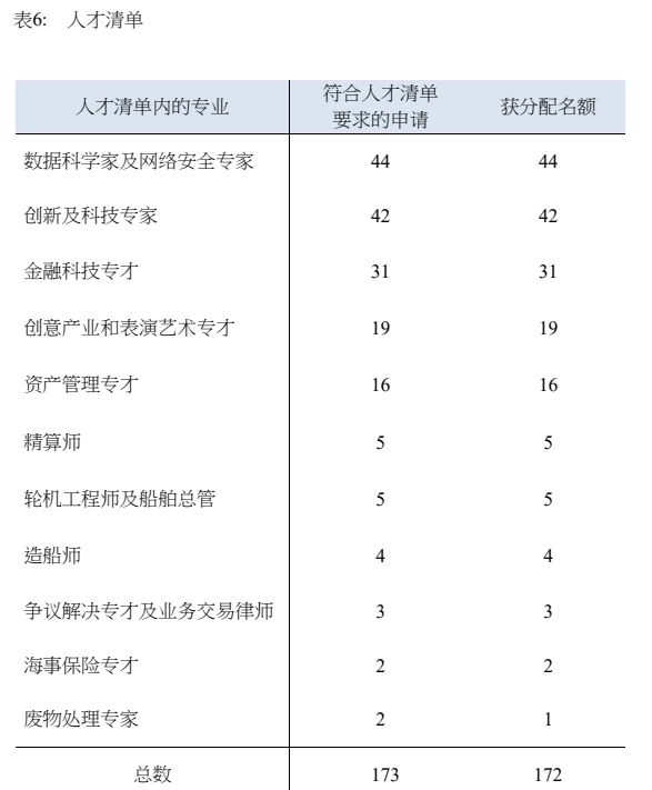 政府在2018年公布首份香港人才清单,截至2021年底,共有173宗的申请符合人才清单的资格。其中,占比最高的有:数据科学家及网络安全专家、创新及科技专家、金融科技人才。符合人才清单的申请人在1979人(综合计分制)的总获批中不足10%,可见没有符合人才清单加分的申请人仍然是主流,而符合人才清单的申请人只是优中择优。
