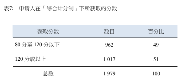 在综合计分制下,80 分至 120 分以下的申请人是几乎占据了一半的名额,可见,分数不是特别高的申请人一样有50%的机会获得名额分配。