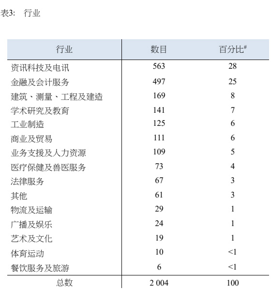 获批申请人当中,「资讯科技及电讯」获得的分配名额是最多的,有563人;其次是「金融及会计服务」有497人。这两个行业的获批人数合计占比53%,占了半壁江山。