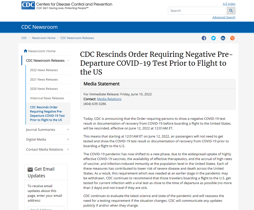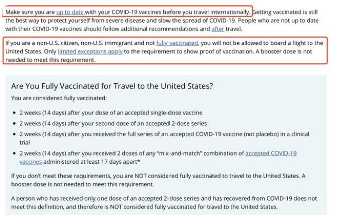 同时CDC也提醒到,国际旅客在出行前,请确保已接种 COVID-19 疫苗。如果您是非美国公民、非美国移民且未完全接种疫苗,您将不被允许登上飞往美国的航班;美国公民或绿卡持有者无此要求。