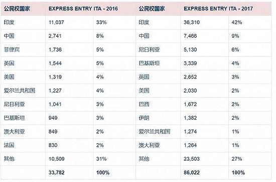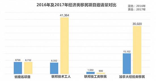 加拿大去年提出“百万移民”计划,希望在未来三年内吸引100万移民。为了配合这一目标完成,该国移民申请管理系统——联邦快速移民通道(Express Entry,简称EE)也很给力,仅向技术劳工类(the Federal Skilled Worker Program)候选人发出的邀请(ITA)就上涨4倍,从2016年的8332人升至2017年的41364人。经验类移民人数的邀请量也从2016年的15102人上涨到35020人。
