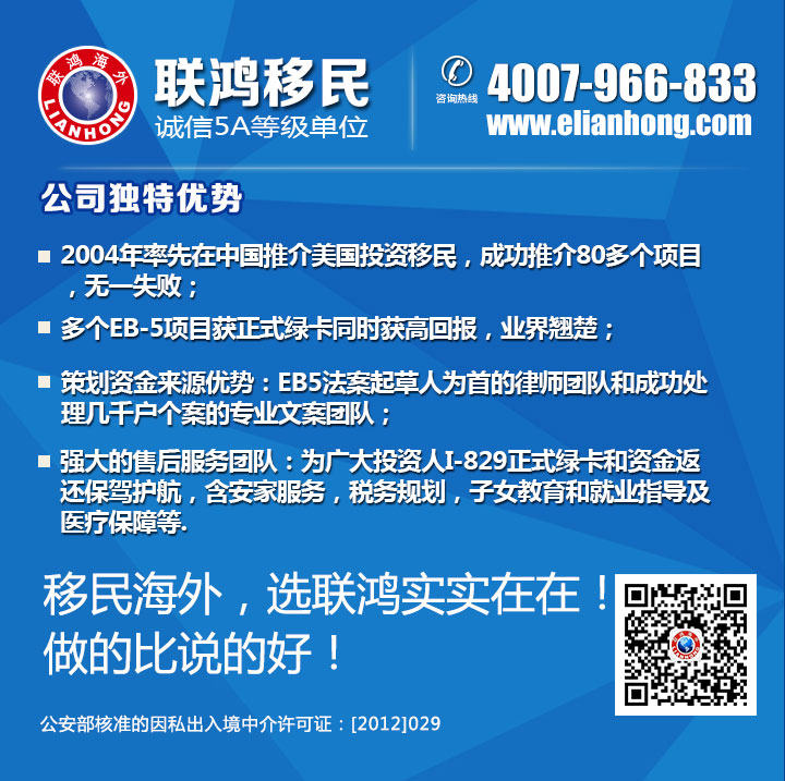 美国移民局确认EB-5法案延期至930,可以说这是投资人50万美元全家移民美国的黄金机会。而目前市面上的移民机构成千上万,为了保证资金安全并顺利获得绿卡,应该挑选美国投资移民老字号公司! 联鸿移民2004年在中国推出美国投资移民,推介项目80余个,无一失败,回头客高达80%,是业界少数把美国投资移民真正做成会“赚钱”的项目。联鸿移民严格筛选项目,2017年推出精选项目——南加州豪华别墅项目,受到市场热烈追捧。 今年美国火爆投资移民项目 ——联鸿加州豪华别墅推介会 广州(5月21日14:00-18:00):天河区天河北路233号中信广场6605室 北京(5月20日14:00-18:00):千禧大酒店三层财富5厅 深圳(5月20日14:00-18:00):丽思卡尔顿酒店六楼清弦厅 席位有限,敬请预约 预约热线:4007-966-833
