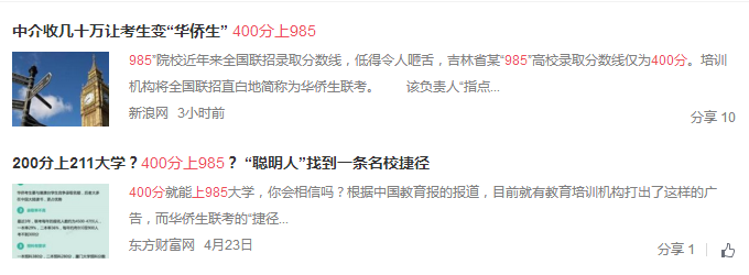 今天微博爆出“400分即能考取国家985大学”新闻,引得广大家长高度重视。“对不起,没能早点告诉你,其实200分就能上‘211’大学。”某教育集团推出的一组“对不起”体营销广告,让“养在深闺人未识”的华侨生联考一时风头尽出。