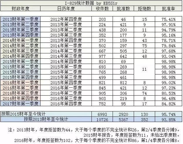 1、 由于4月28日区域中心到期的影响,预计2017年1月-3月递交的申请人不会低于2,500人。等待的队伍将越来越长。 2、 除非4月28日有明确的政策出台,否则在政策变动的预期下,未来办理美国投资移民的申请人不会大幅减少。 3、 在排期日益变长的情况下,如何加快审批速度将是移民局的重点。 I-829审批数据 这张表又说明了啥? 1、 移民局开始减缓I-829申请,本季度批准95份申请远远低于之前四个季度平均每个季度400多的批准量(2016财年)。 2、 通过率降低:本季度一共审理112份申请,批准95份,拒签17份。申请通过率达到:84.82%。 3、积压案例持续增加,已经达到7,072人,按照每年审理1,800人来算,需要3.9年审完。 I-526申请数据 I-829申请数据