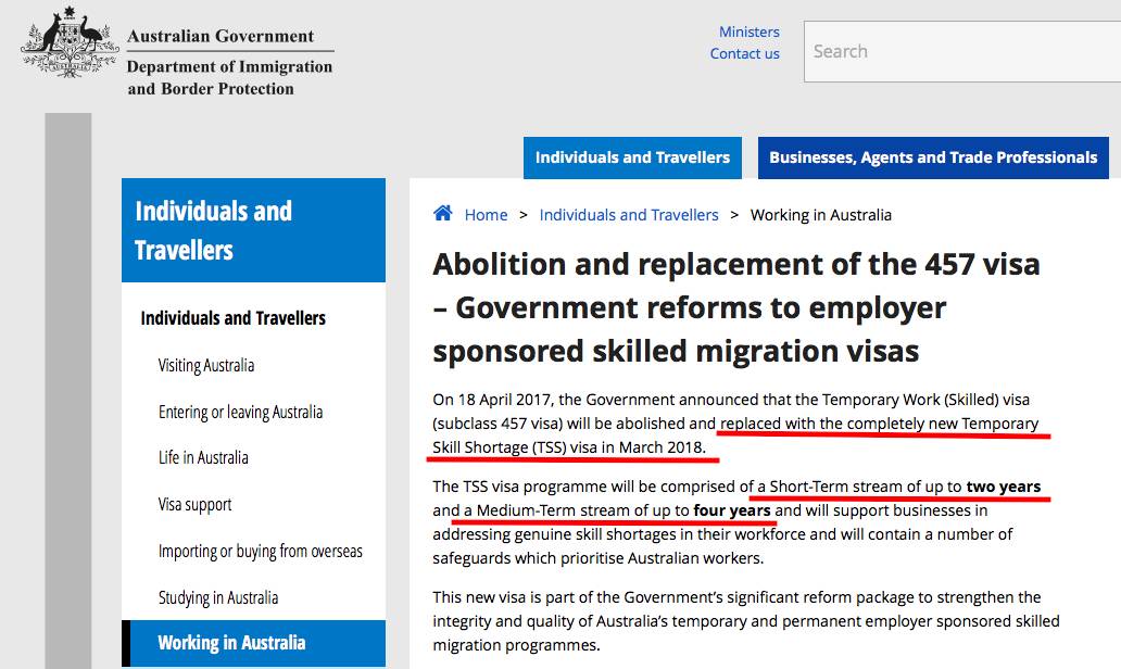 2018年3月份起,457签证将会完全被临时技术短缺(TSS)签证所取代。