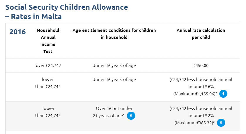 以年收入€24,742为界点,补贴会向年收入低于此数字的家庭倾斜。年收入超过24742欧元家庭只有16岁以下小孩能享受每年450欧元的补贴。年收入低于24742欧元家庭21岁以下的小孩都能得到补贴。16岁以下小孩的补贴计算方法是:(€24742-实际年收入)*6%。最多不超过1155.96欧元/人。 16岁以上21岁以下小孩的的补贴计算方法是:(€24742-实际年收入)*2%。最多不超过385.32欧元/人。相对于马耳他便宜的物价来说,这些补贴足够满足孩子们每天喝牛奶吃面包的需要(牛奶0.86欧元/L,面包0.91欧元/个)。