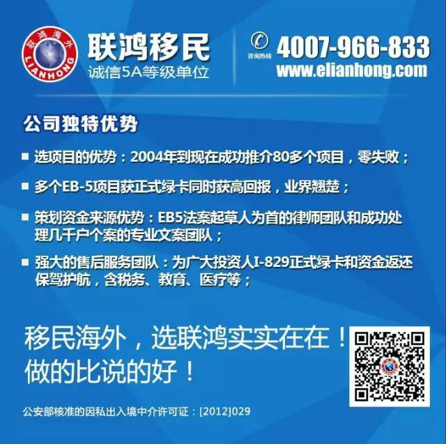 不同途径的移民会有相应不同的政策和执行方式,但他们都有一个共性,即如果你有过申请移民失败的案例,之后的申请会更难通过。这有就是许多技术移民没有十足的把握不轻易申请的原因。 正解:一般第一次被拒以后,以后再申请则难上加难。 有子女的,应尽早申请。 最直接的移民方式:EB-5投资移民 美国投资移民EB-5(Employment-based Fifth Preference),即「第五类优先就业型移民签证」,于1990年立法设定,1991 年起实行。 EB-5法案主要内容是:外国投资者只要在美国境内投资100万美元或在经核淮的区域中心投资50万美元,并直接或间接创造10个就业机会,就可获发二年期的有条件绿卡。五年后投资期满后,资金将予以返还。 EB-5 是美国所有美国移民类别中,申请核淮时间最短、资格条件限制最少的一条便捷通道。